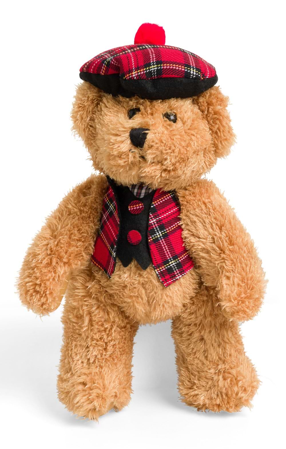 Offered in softly nappy faux fur with traditional teddy bear proportions, this boy bear is proudly dressed in a highland waistcoat and Tam o' Shanter bonnet in traditional tartan.