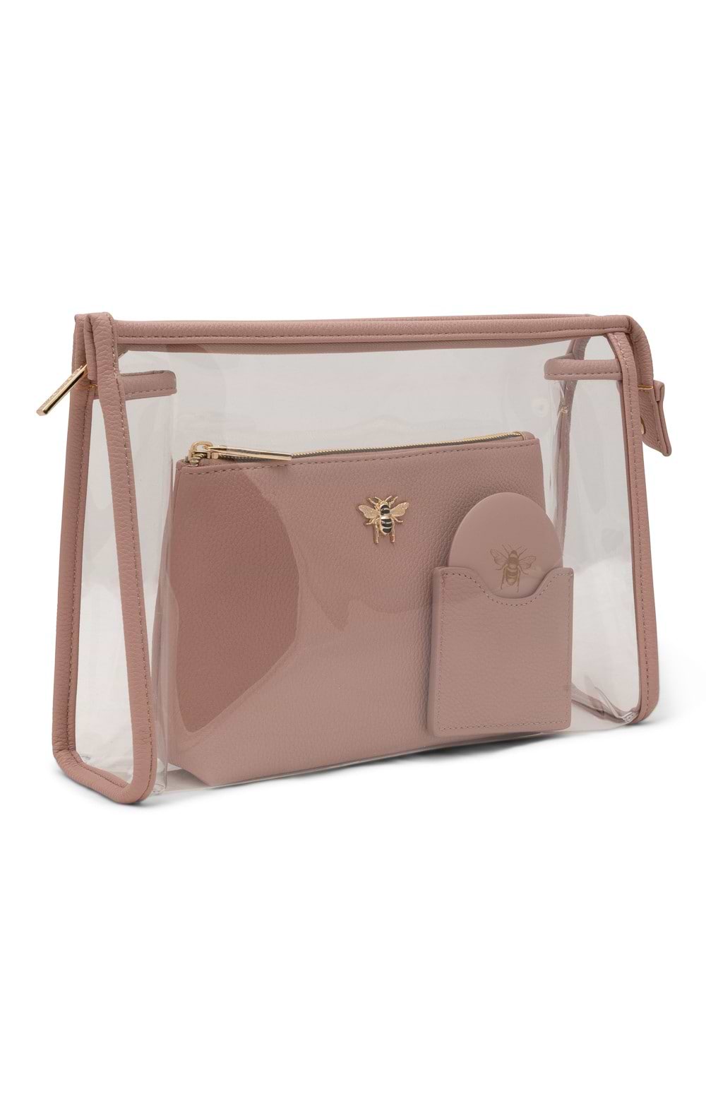 This ladies Alice Wheeler three-piece makeup set combines clear case, luxury vegan beauty bag and compact mirror for stylish on-the-go storage.