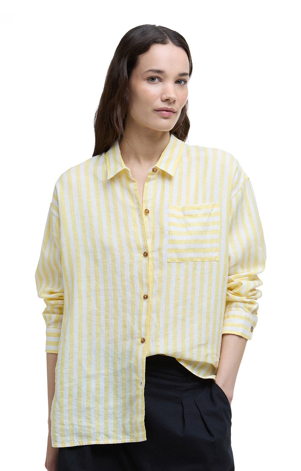 Relaxed vertical candy-stripe shirt in natural linenSubtle pastel shadePatch chest pocket with horizontal stripeBarbour branded buttonsMetallic branded Barbour ID bar to the back neckThis shirt will look great tucked into a skirt or wide leg trousers for work or other semi-formal occasions, but also looks great when thrown over a vest top and jeans.
