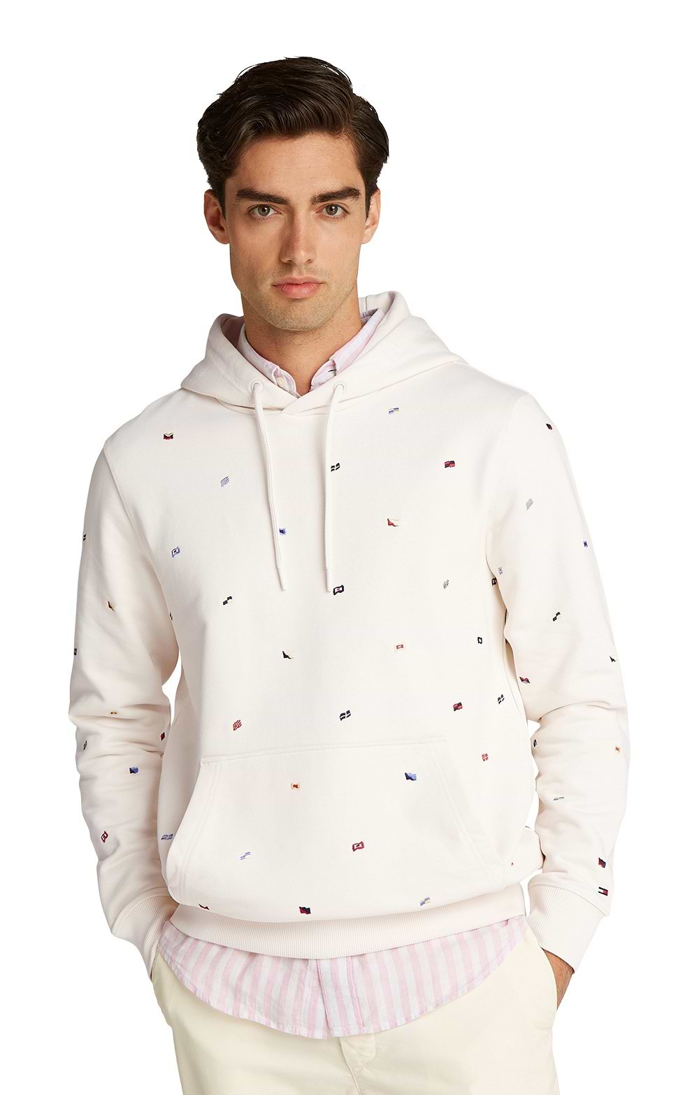 Crafted from 100% regenerative cotton, it provides a soft feel while supporting sustainable practices. A kangaroo pocket adds practicality, while rib-knit cuffs and hem ensure a secure fit. Its relaxed fit and adjustable drawstring hood offer comfort and versatility, while the embroidered flag motifs create a striking pattern that reflects the brand s signature aesthetic. Subtle Tommy Hilfiger branding completes the design with a refined touch.