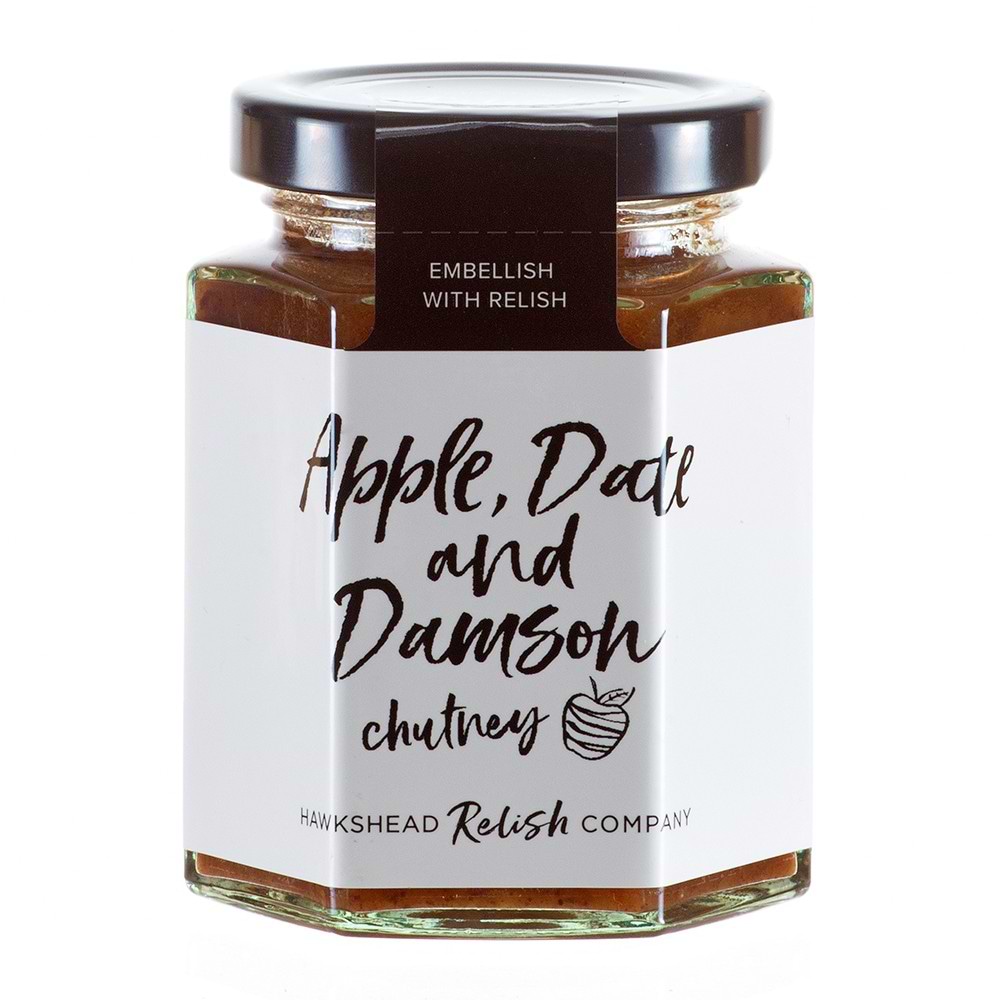 Apples (33%), Acetic Acid, Damsons (15%), Onions, Dates (11%), Brown Sugar, Salt, Mustard Seeds, Allspice, Cayenne Pepper.