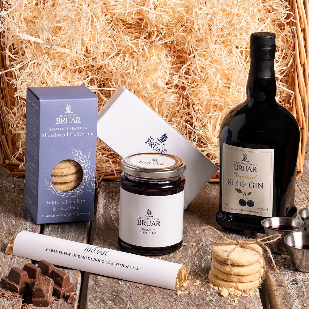 Presented in a beautiful House of Bruar gift box, these carefully selected items make a thoughtful gift or a luxurious treat for yourself. Within the box, enjoy the incredibly popular Sloe gin, a deliciously fragrant liquor perfect for a celebratory tipple. Champagne truffles offer an indulgent touch of luxury to any occasion while the House of Bruar preserves offer long lasting flavour fit for many different snacks. Biscuits and chocolate pull this gift box together with a final touch of sweetness.