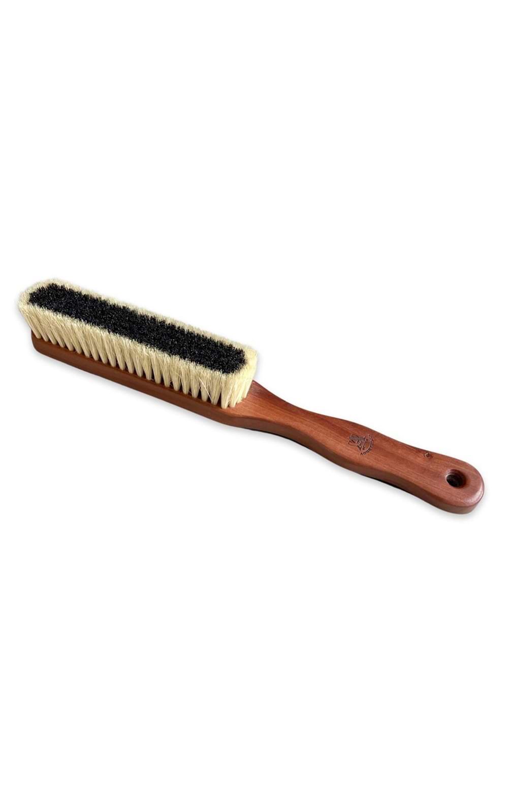 Designed with care, it features a pearwood body backed with polished ox horn, showcasing unique grain patterns that make each piece one of a kind. Measuring 26.5cm in length, it fits comfortably in your hand for easy use. The combination of dark and light pig bristles gently removes lint and pilling from cashmere garments, helping to keep them looking fresh. It makes an ideal present for those who appreciate handcrafted accessories. Whether you're preparing for a formal event or giving your favourite sweater a quick refresh, this brush adds a touch of elegance to your garment care routine.