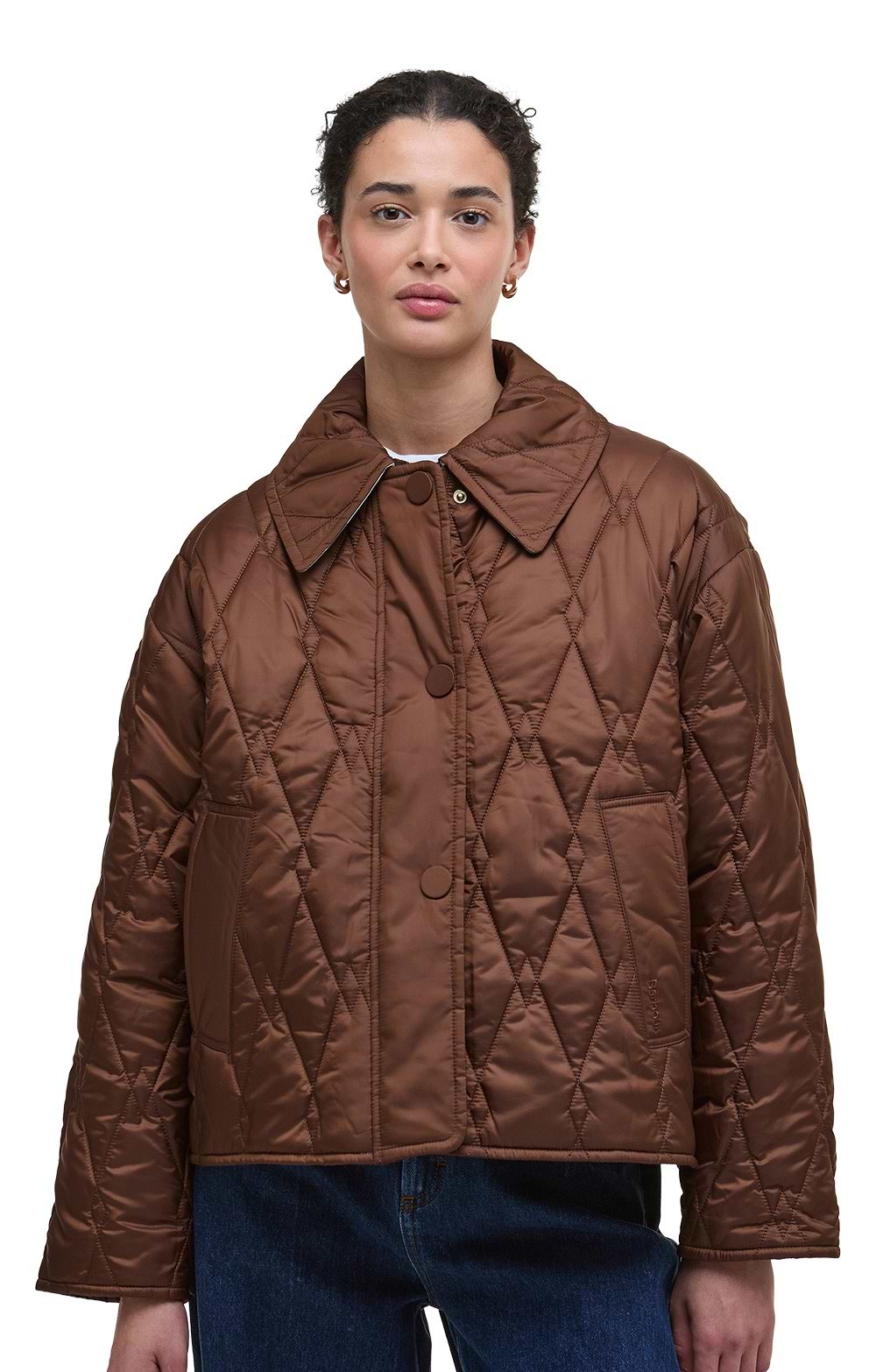 The ladies Barbour Bernadette quilted jacket features oversized fabric-covered studs and a sophisticated two-piece collar with heritage tartan lining.