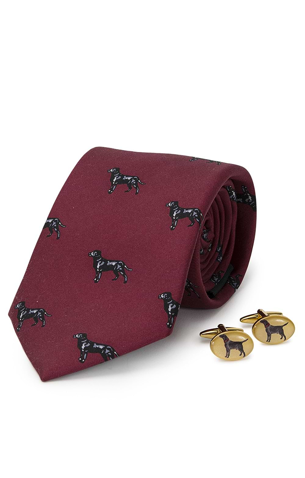 Men's Black Labrador Cufflinks And Silk Tie Set