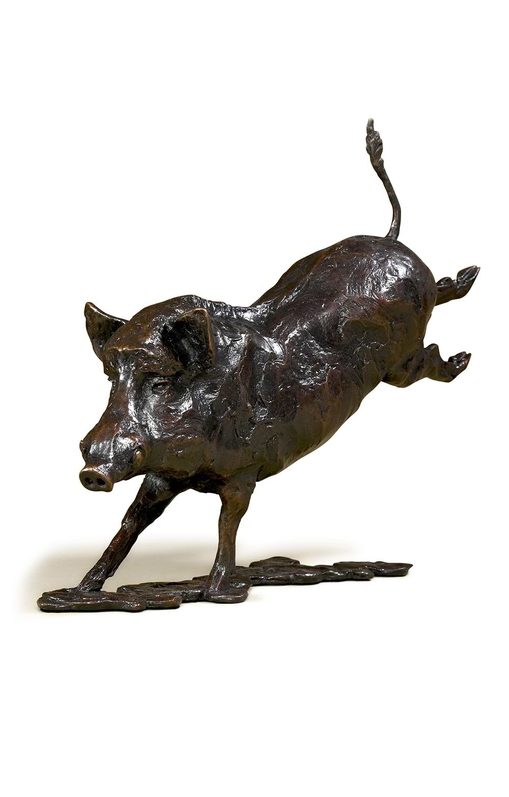 Most people know that pigs are intelligent beasts. Most will also not have had the misfortune of finding out how quick they are. This is one of those remembered scenes, from France as it happens, where I watched one racing and leaping in my general direction, an intent, grey, wiry blur of trouble. It is a humorous piece with plenty of life about it, all atop a rare piece of Iranian travertine. This is the last casting to be made of this work, and is the artist’s own edition.