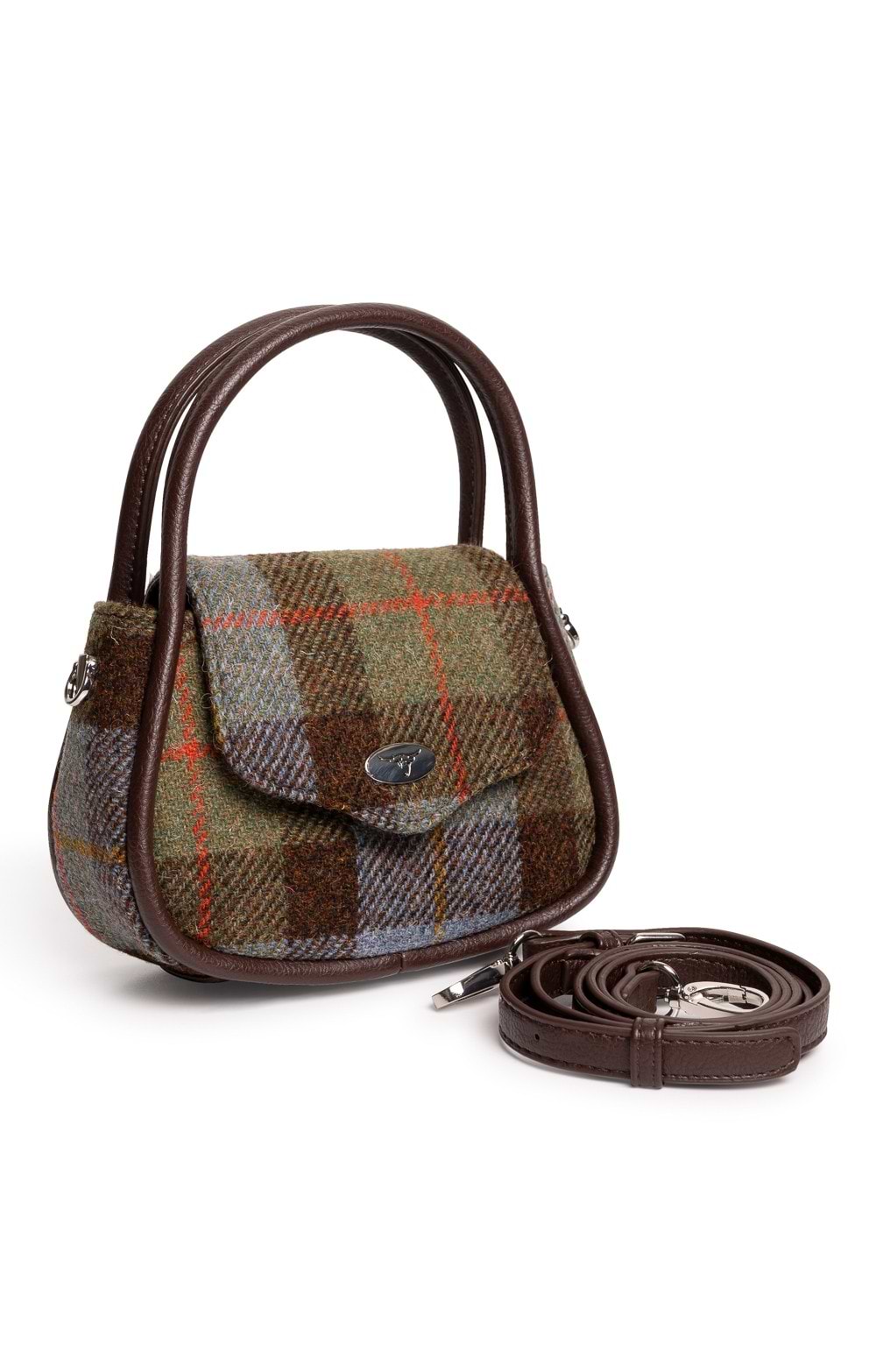 Mini foldover handbag in heritage Harris Tweed®Integrated handles/trims in hardwearing PU-leatherDetachable and adjustable shoulder/cross-body strapLinedMagnetic stud fasteningWonderfully easy to take anywhere, this bag packs a lot of eye-catching punch for its bijou size.