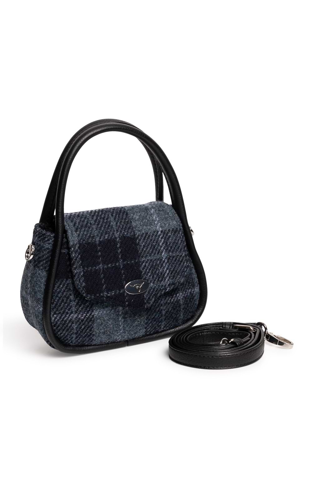 Mini foldover handbag in heritage Harris Tweed®Integrated handles/trims in hardwearing PU-leatherDetachable and adjustable shoulder/cross-body strapLinedMagnetic stud fasteningWonderfully easy to take anywhere, this bag packs a lot of eye-catching punch for its bijou size.