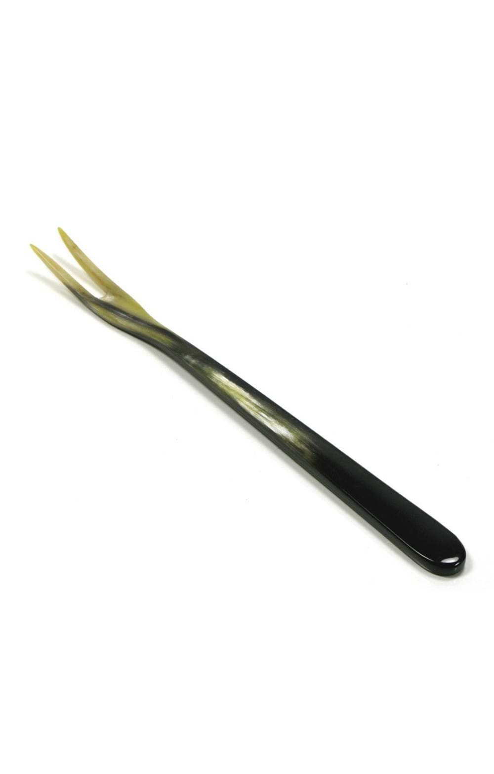 Handmade from polished cow hornMeasures approx. 12mm by 178mmFeatures two pointed prongsEach piece has unique grain patternsSuitable for olives, pickles and small garnishesA delightful addition to any cutlery drawer and a quirky yet thoughtful gift for foodies and hornware fans alike.