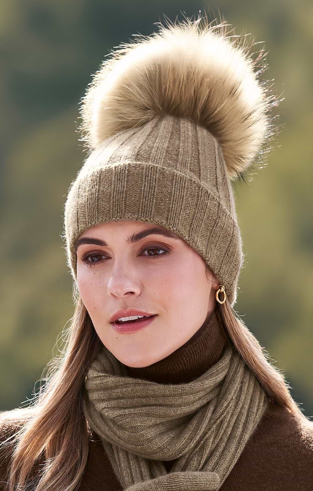 Ladies Cashmere Hat with Fox Fur Pom Pom