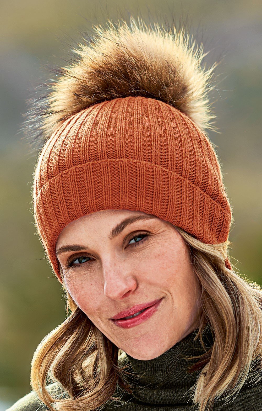Ladies Cashmere Hat with Fox Fur Pom Pom