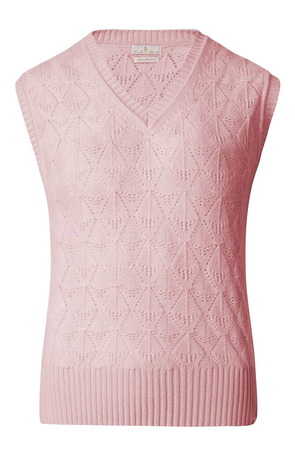 Featuring a gorgeously pretty diamond pattern fancy knit with vintage-inspired pointelle eyelets, this is a delightful cashmere layer that's perfect for summer. With a flattering double-ribbed V-neck and double ribbing to the shoulders and hem, this pretty sleeveless pullover provides endless layering possibilities.