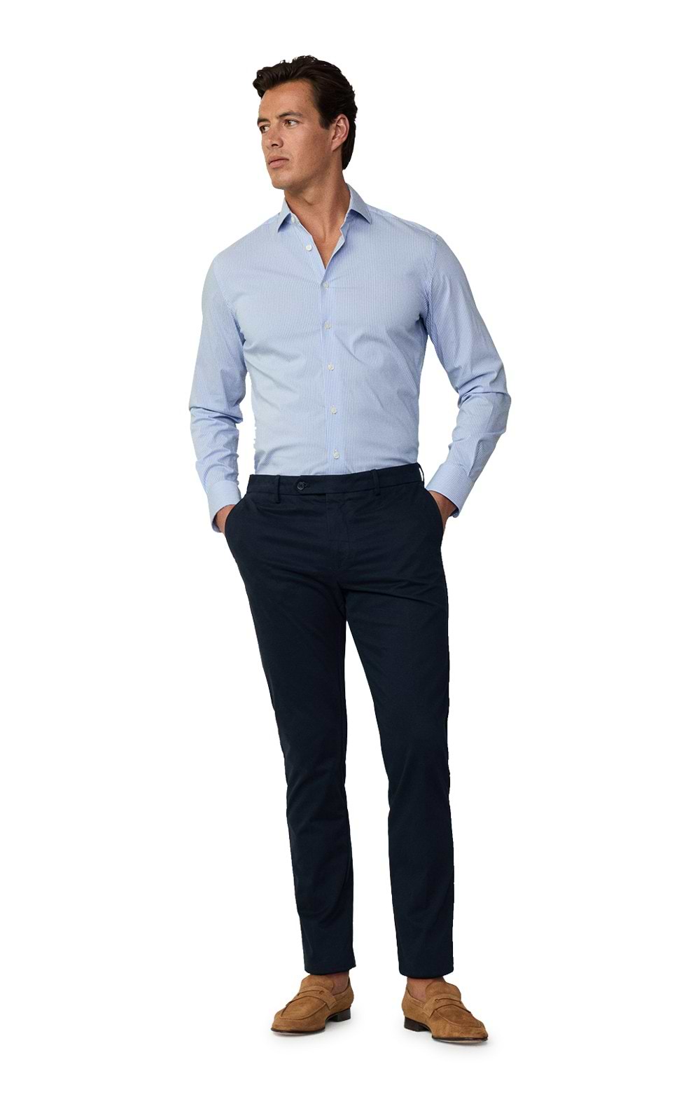 Crafted from a soft cotton twill blend with a hint of stretch, these chinos provide both comfort and a refined appearance. The slim fit design creates a contemporary silhouette, while the concealed fly ensures a clean and polished look. Practical features include side pockets and back welt pockets, adding functionality without compromising style. Whether you're navigating a busy day at the office or enjoying a leisurely weekend outing, these chinos are an ideal choice.