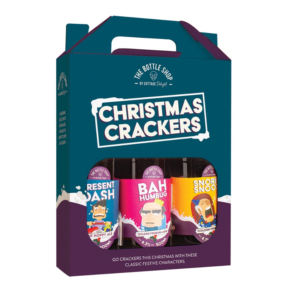 Bah Humbug (Golden Premium Lager) Alc 4.3% abv., Present Dash (Light Hoppy Ale) Alc 4.2% Vol, Snoring Snoozer (Golden Premium Ale) Alc 4.7% Vol. Contains WHEAT and BARLEY
