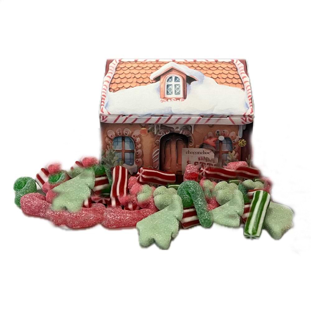 Candy cane:Glucose syrup, sugar,corn starch, water, acid,(citric acid) acidity regulator (E331) Flavouring.Colours (E133,E129,E103) .Trees:Glucose syrup, Sugar, Corn Starch, Gelatine (Beef), Humectant: glycerol; Acids: citric acid, malic acid; Plant vegetable and fruit concentrates (safflower, spirulina, radish, blackcurrant, carrot), Gelling agent: pectins; Flavourings, Colour: E120. Cable poles:Sugar, glucose-fructose syrup, invert sugar syrup, wheat flour, corn starch, vegetable fat (palm), humectant (glycerol), acids (malic acid, citric acid), potato starch, gelatine (pork), flavourings, vegetable oils (coconut, palm), acidity regulator (potassium citrates), emulsifier (E471), salt, colours (E100, E120, E133)