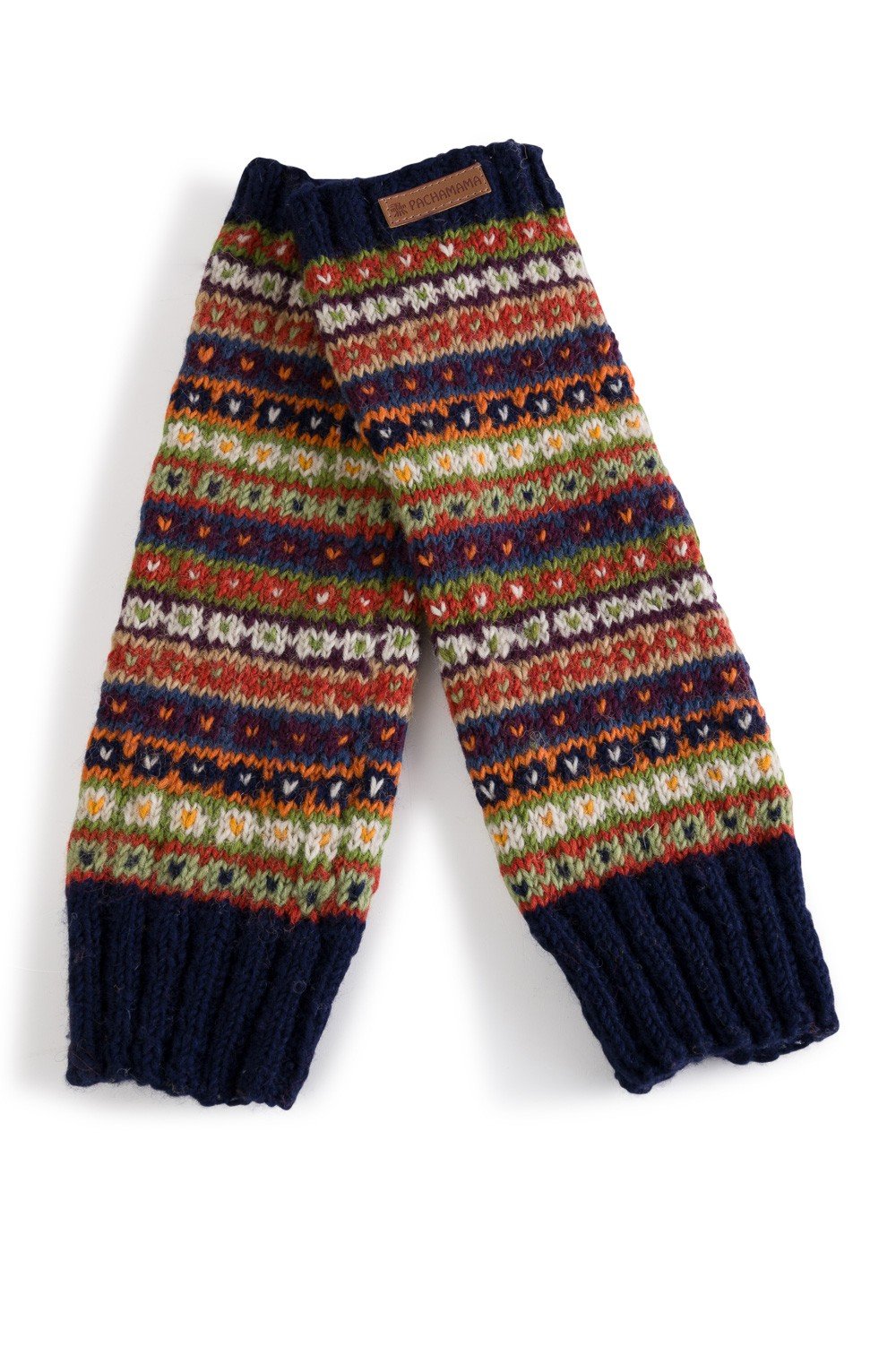 Extremely underrated as a garment, legwarmers are brilliantly useful in colder weather, especially if you're wearing leggings, wellies or winter tights. This delightful Pachamama pair have been lovingly hand-knitted from chunky pure wool, and feature a colourful Fairisle-inspired design in rich colours, led by deep navy.