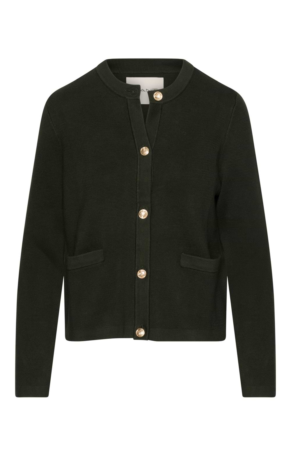 Regular fit with crew neckline100% organic cotton with Milano knit structureBranded gold-toned buttons secure welt pocketsPerfectly designed, this ladies Gant contrast knit cardigan is an essential addition to your wardrobe.