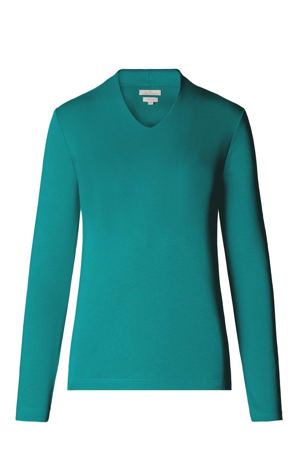 Available in a broad spectrum of colours, from muted country classics to strident primary tones, our V-neck top is a highly adaptable quality basic that you will come to depend upon. With a fitted style, long set-in sleeves and a medium-deep V-neck that is perfectly judged for showing off your favourite chains or pendants, this top even has double layering across the front as an additional quality feature.