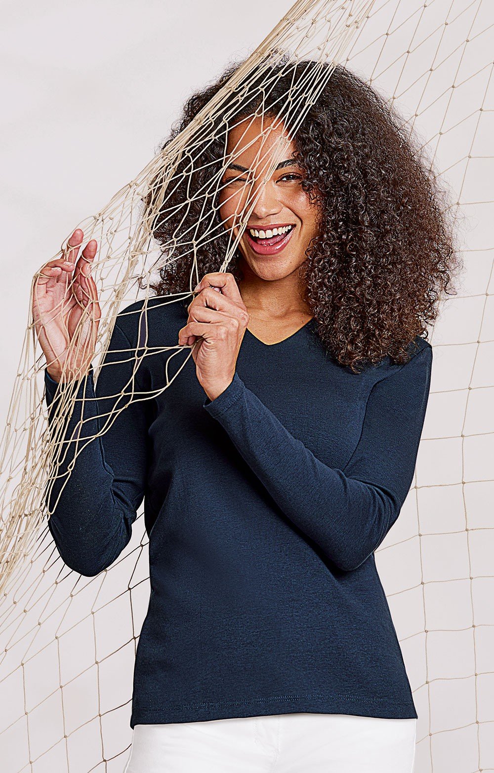 Available in a broad spectrum of colours, from muted country classics to strident primary tones, our V-neck top is a highly adaptable quality basic that you will come to depend upon. With a fitted style, long set-in sleeves and a medium-deep V-neck that is perfectly judged for showing off your favourite chains or pendants, this top even has double layering across the front as an additional quality feature.