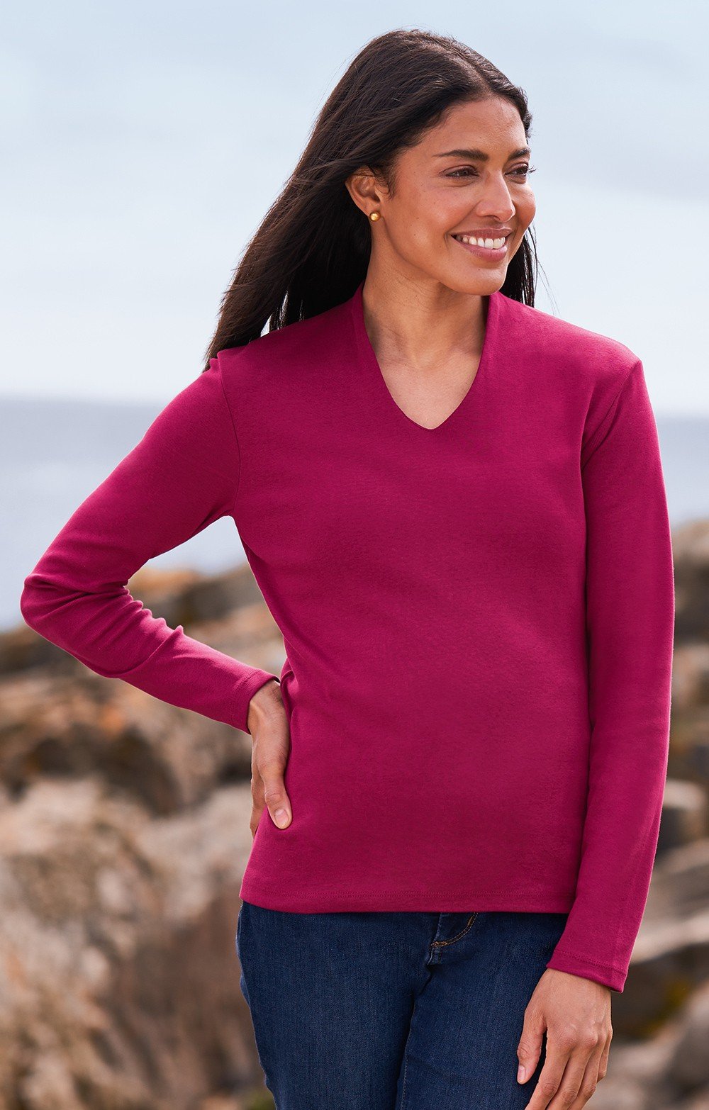 Available in a broad spectrum of colours, from muted country classics to strident primary tones, our V-neck top is a highly adaptable quality basic that you will come to depend upon. With a fitted style, long set-in sleeves and a medium-deep V-neck that is perfectly judged for showing off your favourite chains or pendants, this top even has double layering across the front as an additional quality feature.