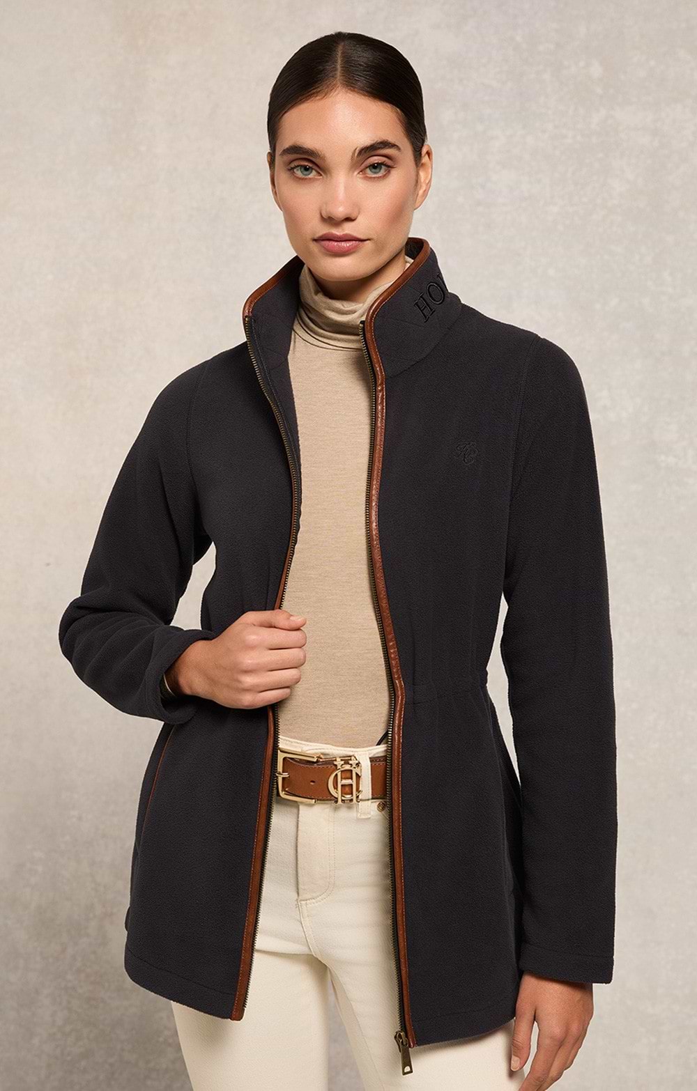 Classic country microfleeceCovers the hipsTailored shapeMock front jacketBurnished look faux leather trim detailsSelf fabric fleece welt pocketsHC embroidery to the chestWoven tab to the side seamsFaux leather back D-yokeQuilt stitch to the collarAntique brass metal hardwareThe ladies Holland Cooper country longline fleece is an enduring addition to any wardrobe.