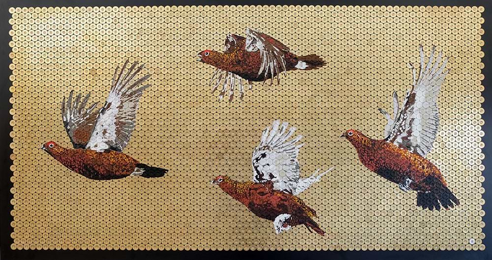 Large painting of a covey of red grouse in flight, painted on a background of recycled cartridge shells.