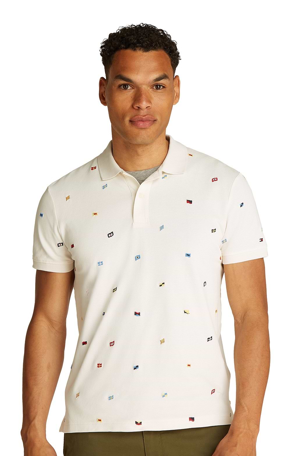 Embroidered with an array of miniature flags, the men's Tommy Hilfiger critter polo brings a distinctive touch to classic styling.