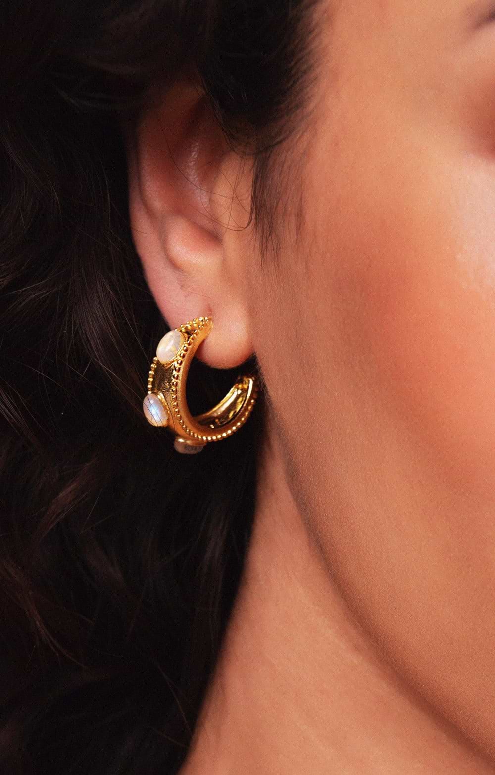 Chunky hoop earrings in gold-plated brassSet with exquisite labradoritesDelicate beaded metalworkPost and butterfly fasteningIf you love yellow metal jewellery and you like adding unique pieces to your collection, these Ashiana London earrings are a must. They will also make a beautiful gift, if you can bear to part with them!