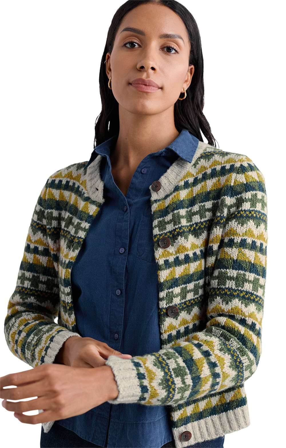 The ladies Seasalt Dawson Pick Fair Isle jumper in RWS-certified merino blend features jersey stitch body with ribbed trim and crew neck.