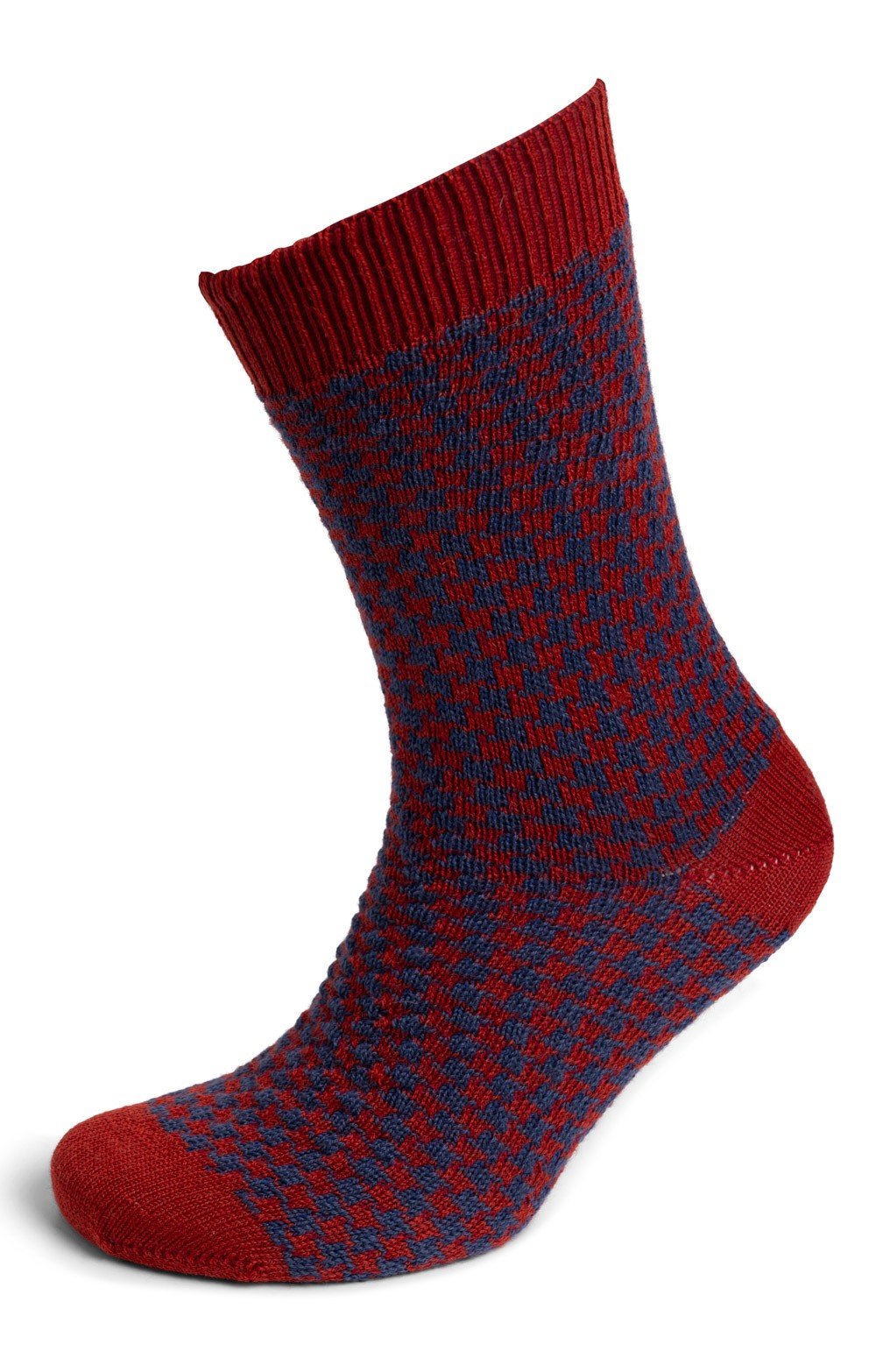 Scottish-made socks in merino-rich yarn.Classic dogtooth check design.Traditional contrast colour to toe, heel and hem.These socks will make a wonderful gift for a friend, especially when presented in a House of Bruar gift box or if your favourite socks have seen better days, why not treat yourself?