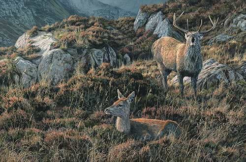 Eight Pointer' Roaring Red Deer Stag & Hind by Martin Ridley