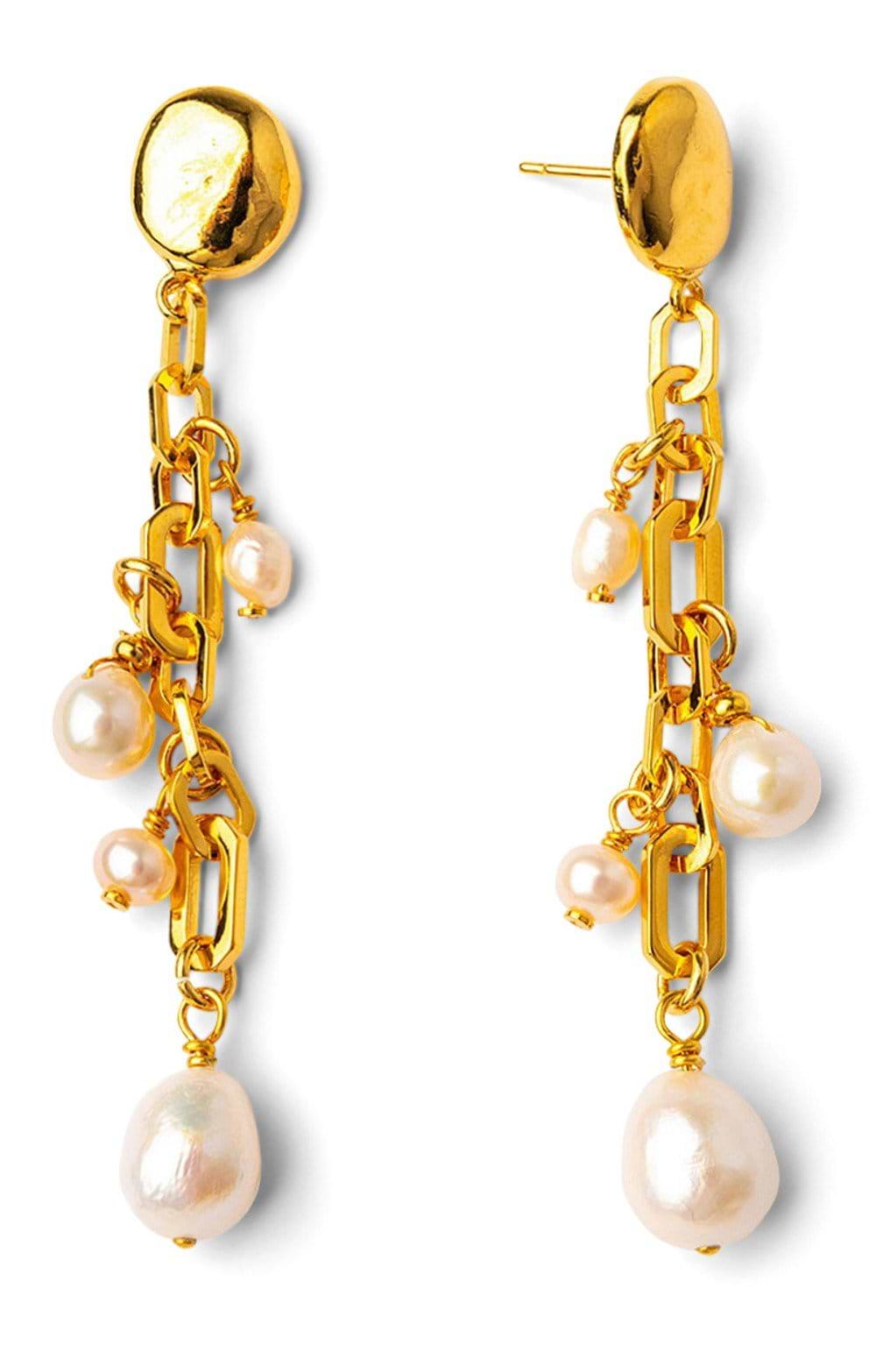 Ladies Gold Plated Stud Small Pearl Drop Chain Earrings