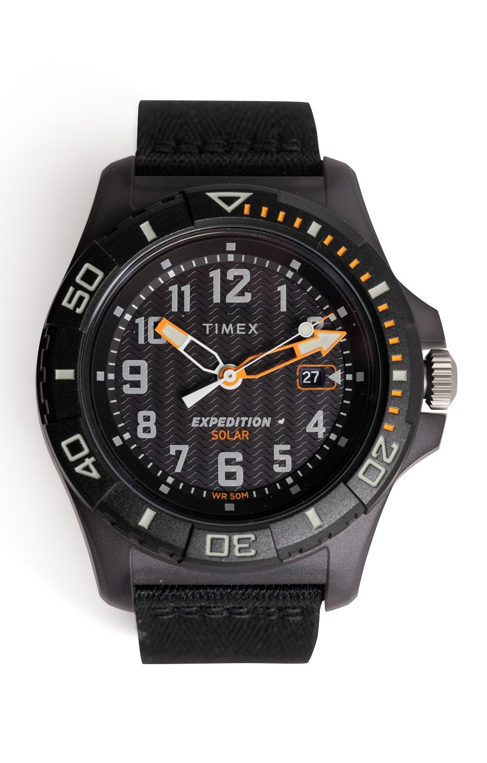 With a solar-powered movement and a recycled plastic strap, the men's Timex Expedition North Freedive Ocean watch is a diving watch with a green conscience.