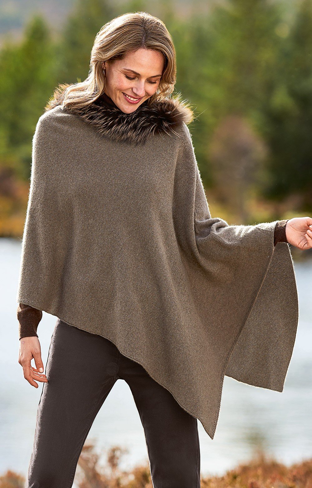 Delicately crafted for luxurious comfort, the ladies fox fur and cashmere poncho brings a touch of sophistication to any outfit.