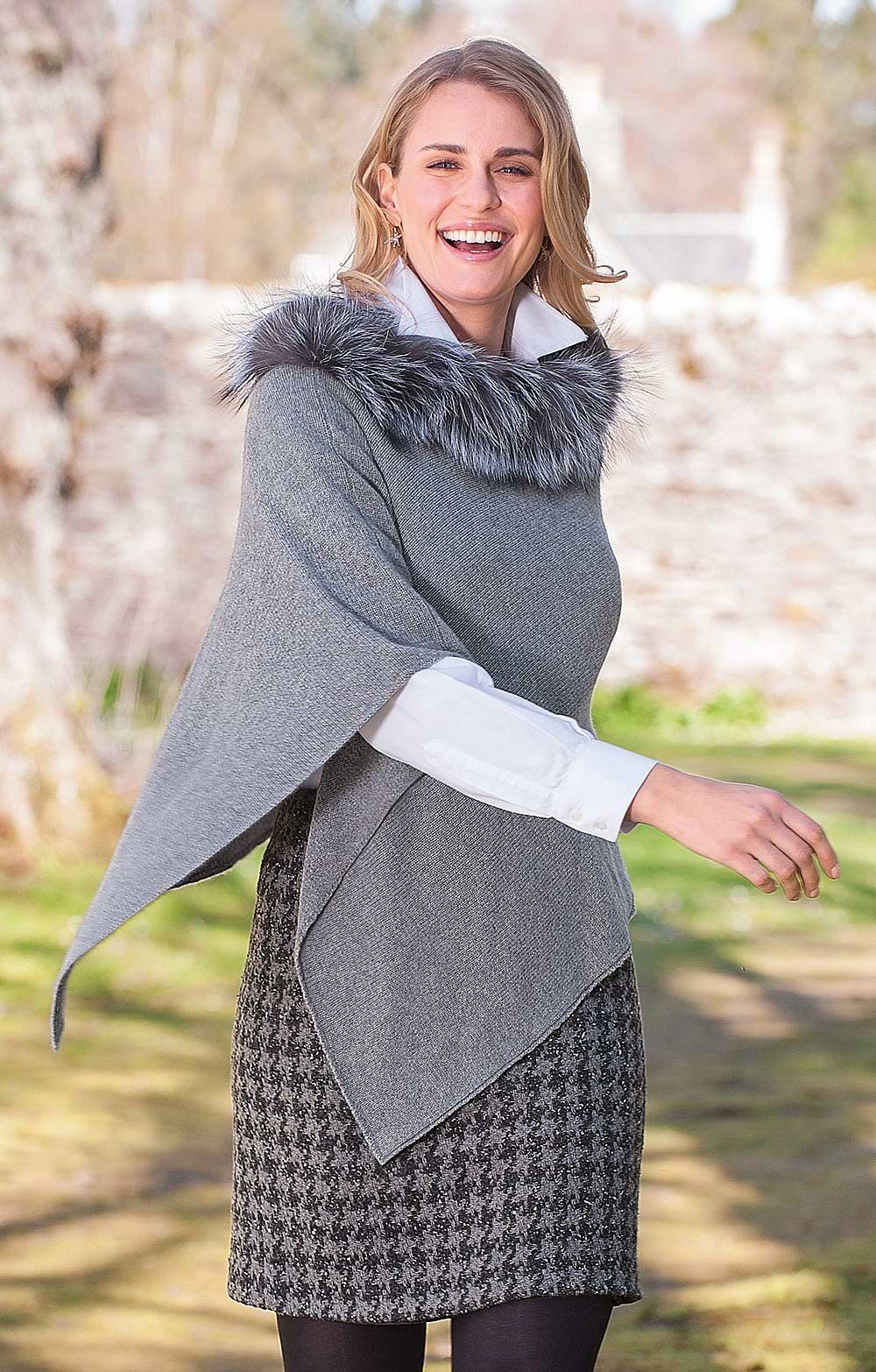 Delicately crafted for luxurious comfort, the ladies fox fur and cashmere poncho brings a touch of sophistication to any outfit.