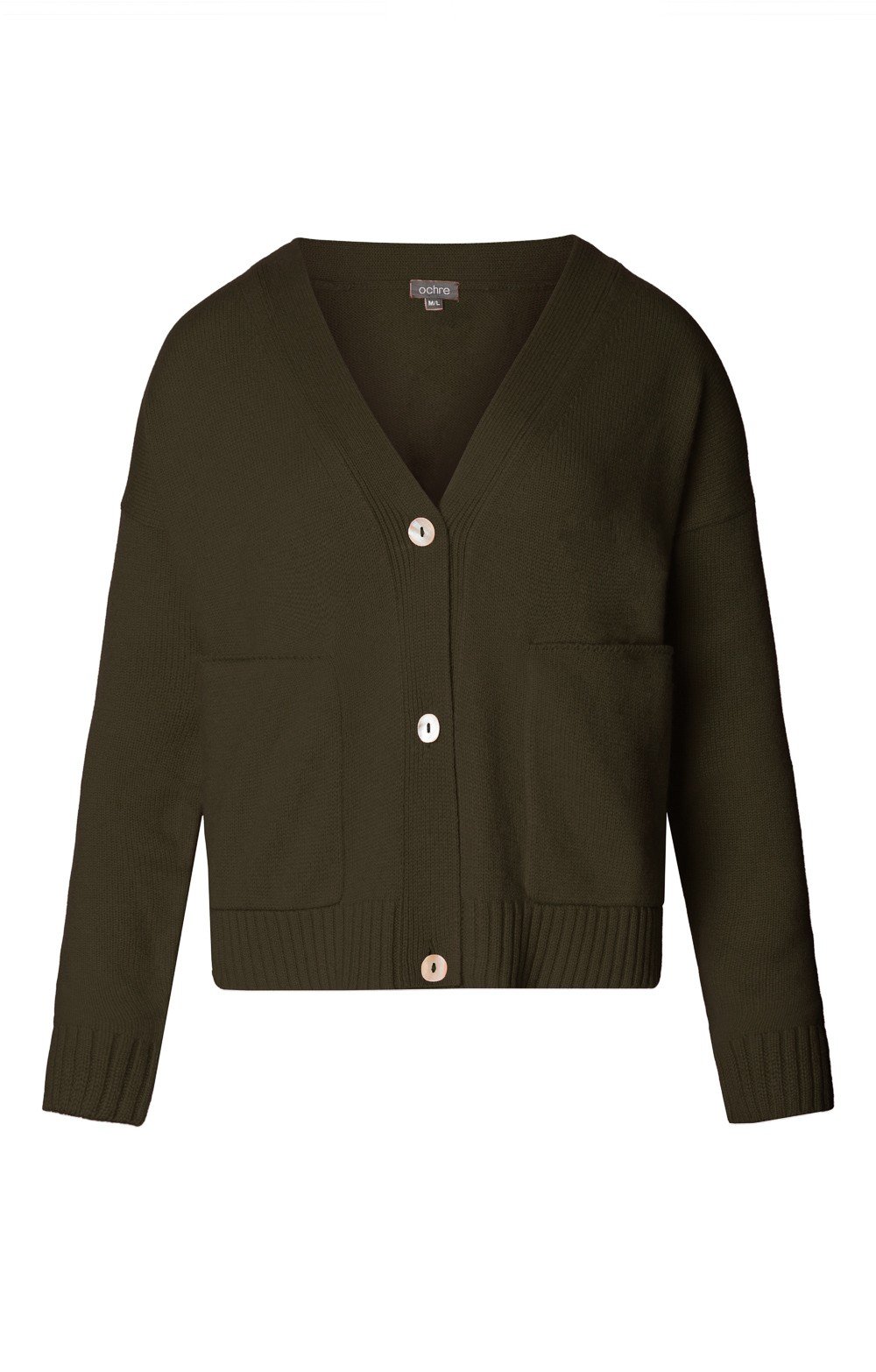 The relaxed fit is complemented by a V-neckline and three delicate pearl buttons, allowing for versatile styling options. Functional yet stylish, the two front patch pockets add a practical touch, while ribbed cuffs and hem provide a comfortable fit.