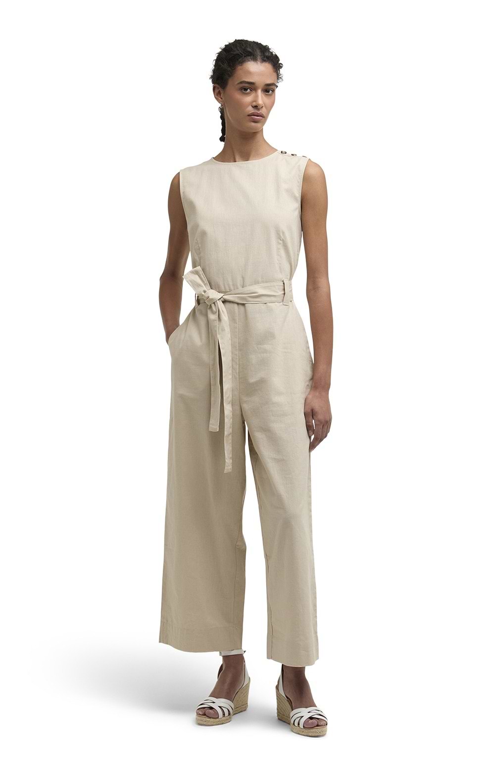 Sleeveless design jumpsuitTonal fabric tie beltLightweight cotton blend fabricCropped wide legSimply add sandals and a straw bag for instant summer style, or dress up with heels and gold jewellery for evenings out.