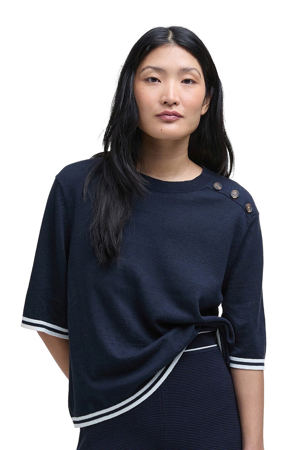 Finely knitted nautical top in cotton and linenLoose elbow-length sleeves with double contrast stripeLoose boxy hemline with double contrast stripeShoulder button detail on leftCrew neckMetallic tag to back neckEnjoy wearing with wide-leg trousers for a great work or semiformal look, or team with a jean skirt for fresh weekend style.