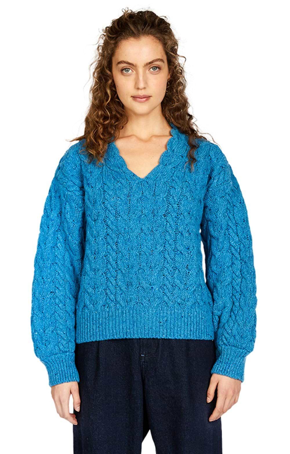 The Hapenny horsehoe sweater radiates a perfect blend of femininity and comfort with its slouchy yet flattering fit. This unique design is adorned with an intricate all-over cable pattern, an enchanting horseshoe cabled neckline detail and voluminous sleeves, and is elegantly finished with ribbed cuffs. Whether you choose your regular size or decide to size up for an effortlessly oversized look, the sweater offers a comfortable and stylish experience. Crafted from a premium blend of 95% wool and 5% cashmere, its luxurious hand feel makes it the perfect addition to your wardrobe.