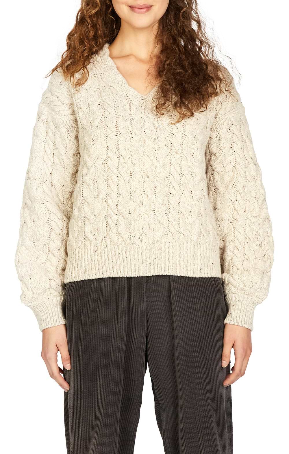The Hapenny horsehoe sweater radiates a perfect blend of femininity and comfort with its slouchy yet flattering fit. This unique design is adorned with an intricate all-over cable pattern, an enchanting horseshoe cabled neckline detail and voluminous sleeves, and is elegantly finished with ribbed cuffs. Whether you choose your regular size or decide to size up for an effortlessly oversized look, the sweater offers a comfortable and stylish experience. Crafted from a premium blend of 95% wool and 5% cashmere, its luxurious hand feel makes it the perfect addition to your wardrobe.