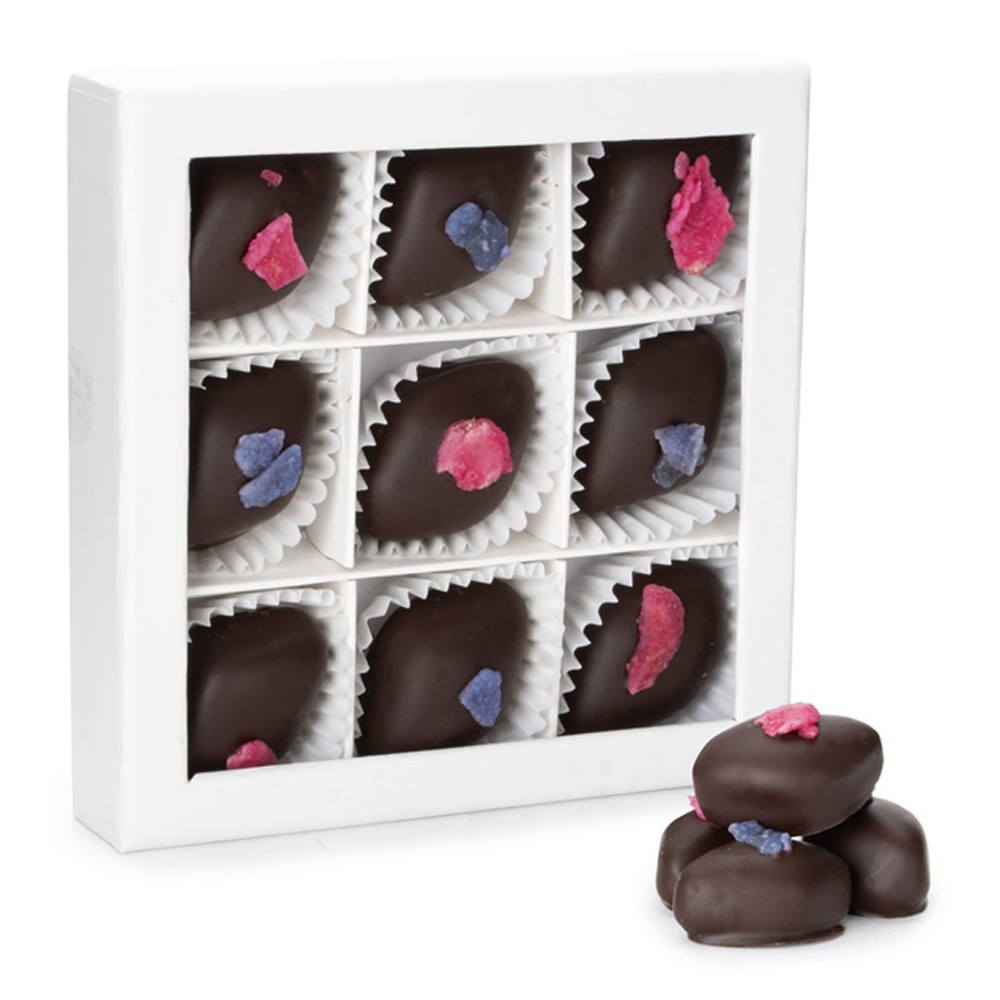 Ingredients: Sugar, Cocoa Mass, Glucose Syrup, Cocoa Butter, Emulsifier (Soya Lecithin), Natural Flavourings, Natural Flowers, Stabiliser (Gum Arabic), Colours (Cochineal, Beetroot Red, Indigo Carmine), Invertase Flavourings. Dark Chocolate Contains Cocoa Solids 70% minimum. May also contain milk & traces of Nut, Wheat Gluten & Egg.