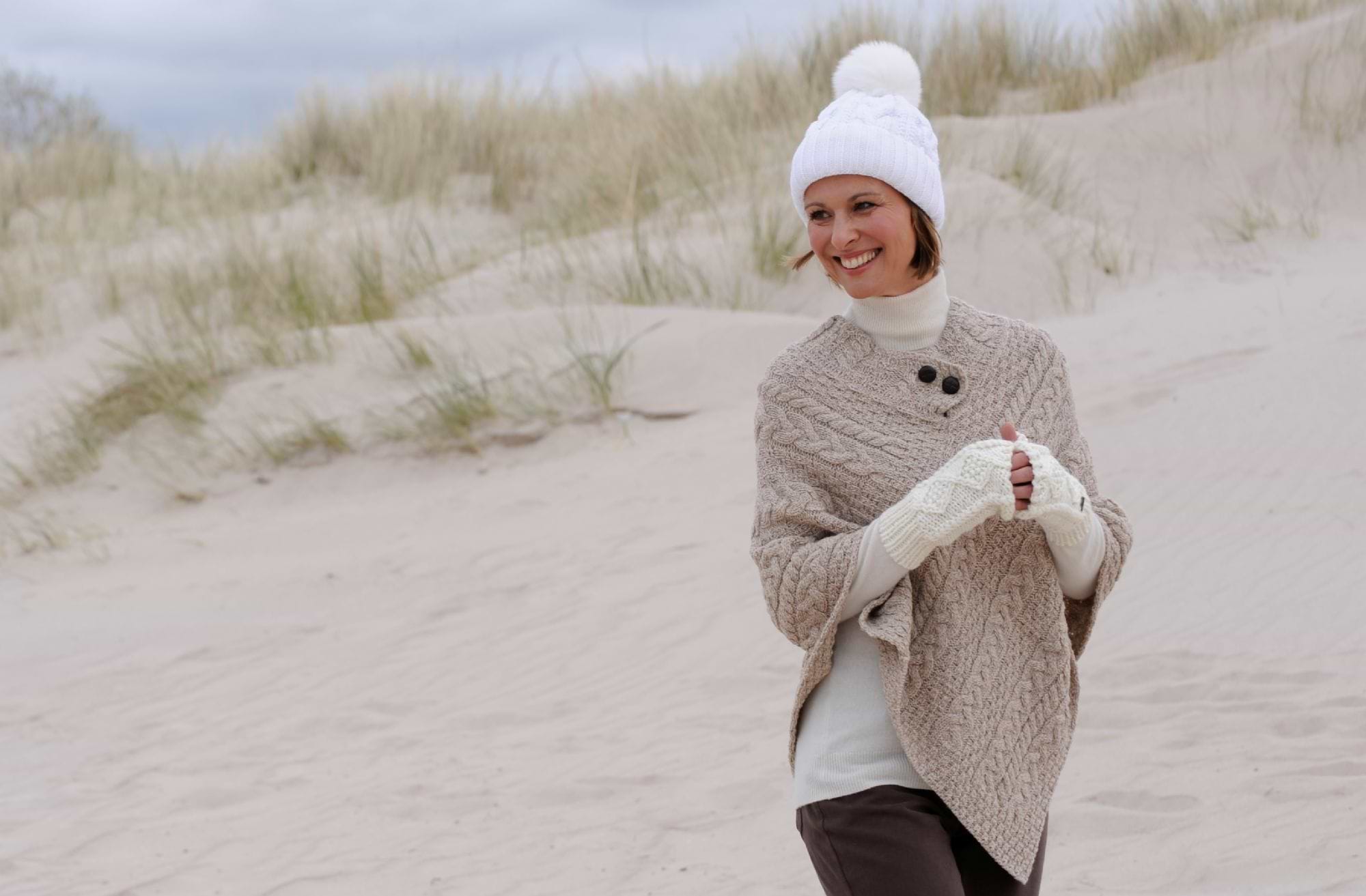 Our second look is for days when the cold is drier. Layering up a few natural fibres is the best way to ensure you keep warm in the chill. Start with this cashmere roll neck jumper which will keep your body warm. Layering this Aran knit poncho on top will allow you to move whilst also ensuring you stay warm. Finish off the look with these plaid trousers to add a touch of interest to and their 100% wool composition will keep the cold off. Don't forget to keep your hands and head warm with these gauzy cashmere gloves and matching beret - in case the day gets cooler.