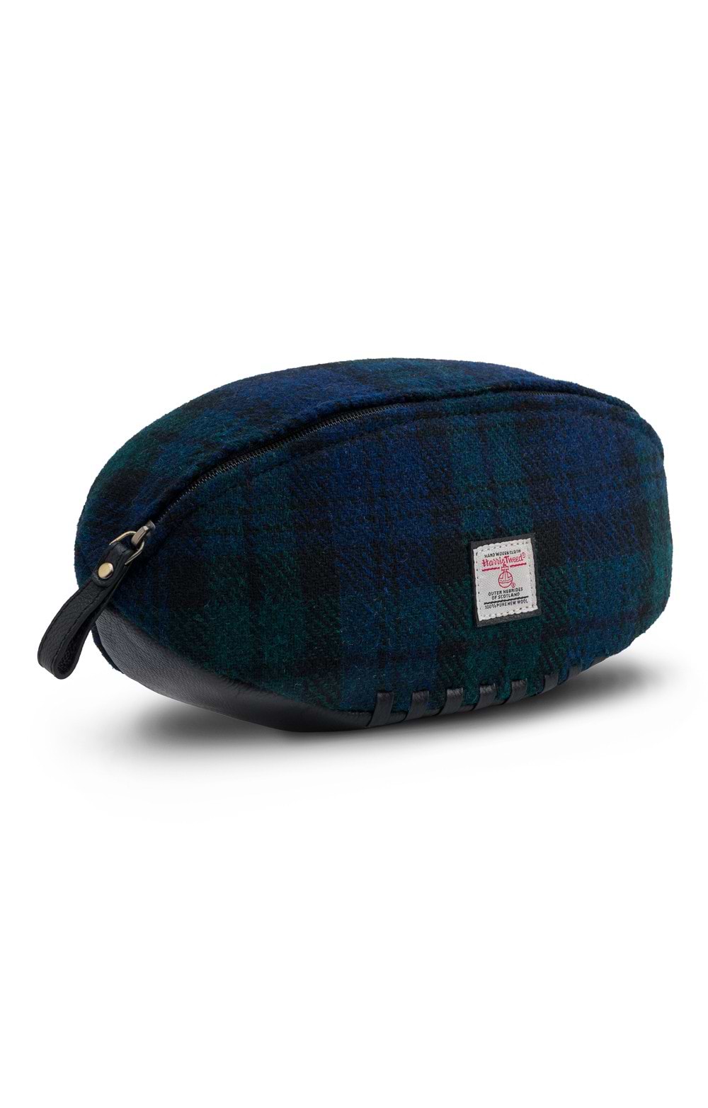 Authentic Harris Tweed and leather toiletry bagDurable leather baseGolden brass hardwareSecure zip closureCompact rugby-ball shapeThis Harris Tweed® and leather rugby ball washbag is an exquisite blend of style and function.