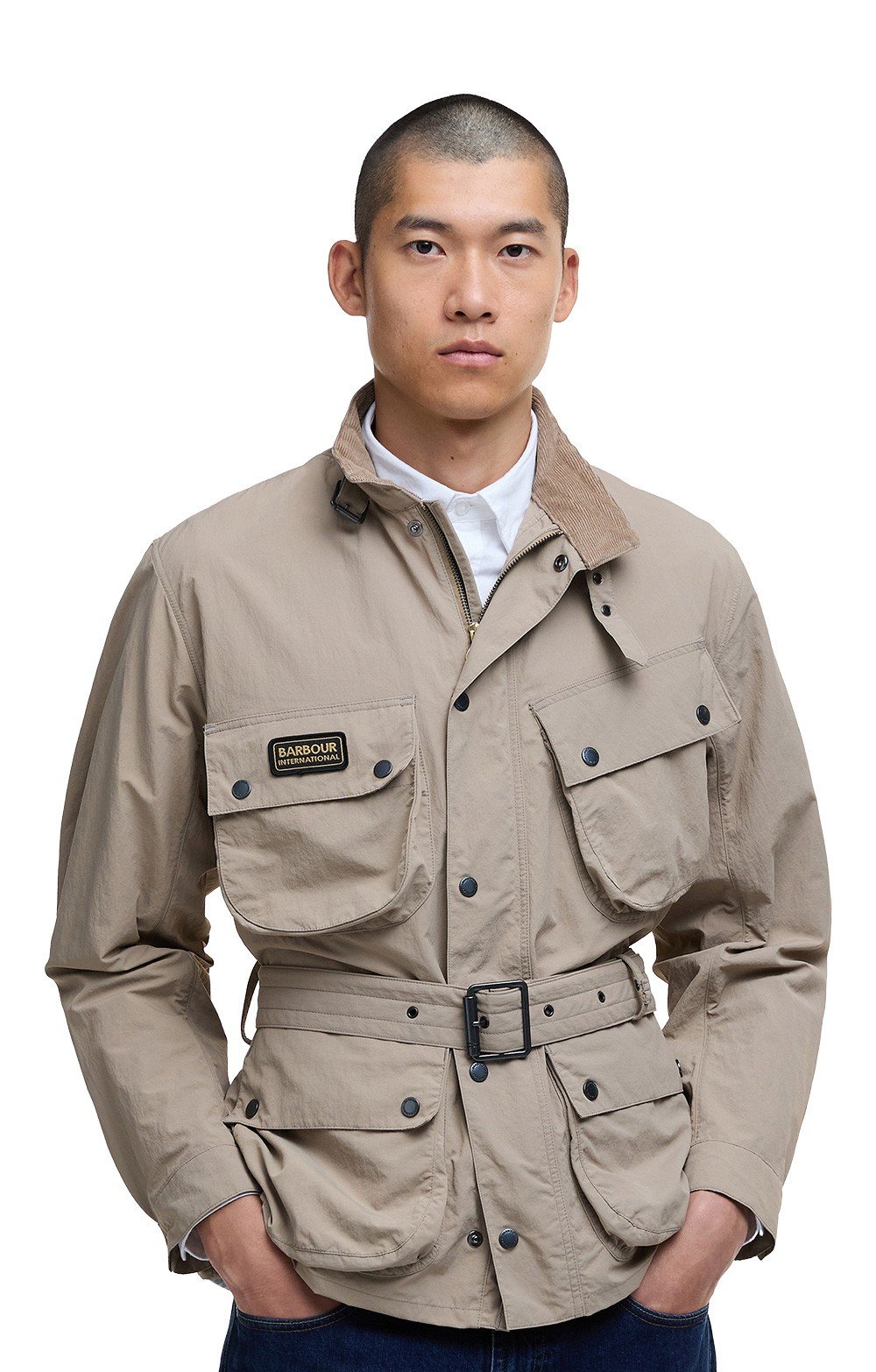 Lightweight showerproof utility jacketAdjustable buckle beltStorm placketBellows pockets with press studs to the chest and sidesInner needlecord collarThroat latch with buckle adjustmentBarbour zip pullBarbour International rubberised branding to chest pocketThis light between-seasons jacket will look great with simple blue jeans, tennis shoes and a polo or crew neck tee, but is also smart enough for semi-formal work environments.