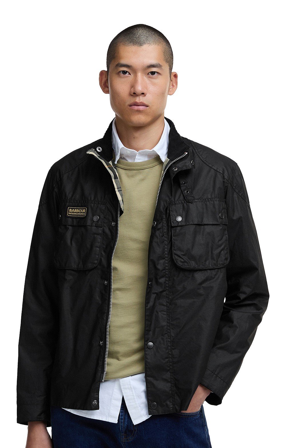 Wax cotton biker jacketStand collar with throat latchCord inner collar with tartan check zip liningStorm placket with studs and zipStud flap bellows pockets to chestAdjustable stud tabs to rear hemBarbour International rubberised badge to right chest pocketThis jacket will look great with blue jeans and crew tops, but if you usually live in chinos and Tattersall check shirts, this will also work delivering a slight edge to your country look.