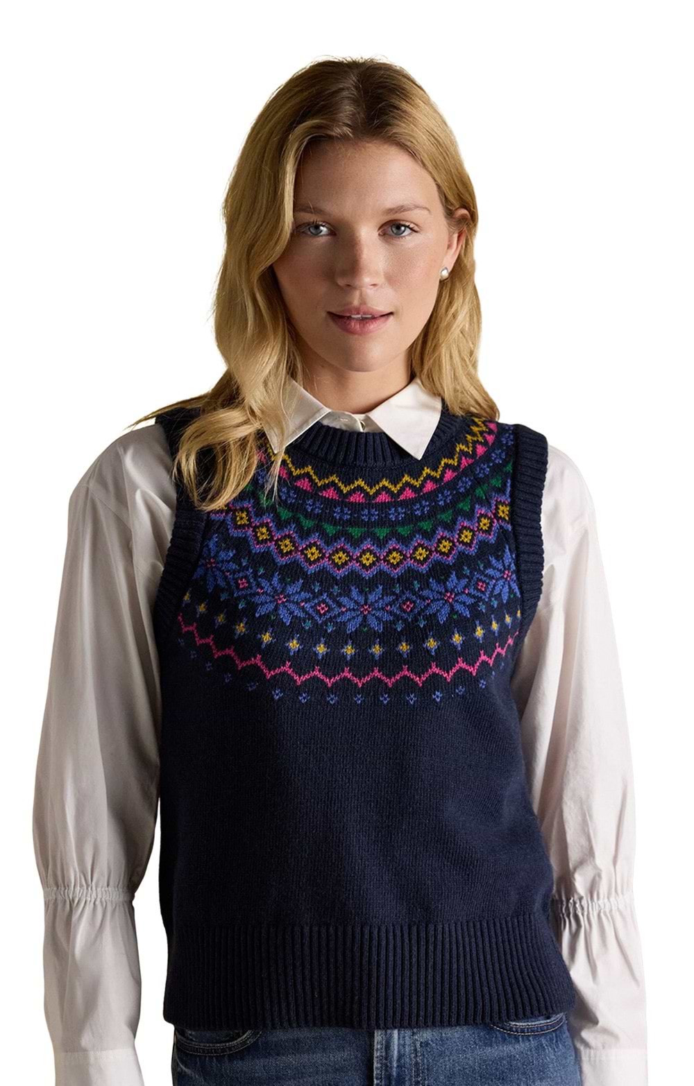 The ladies Joules Alba Nordic Fairisle tank top is a sleeveless slipover with yoke motif, cotton-wool blend and rib trims for layering ease.