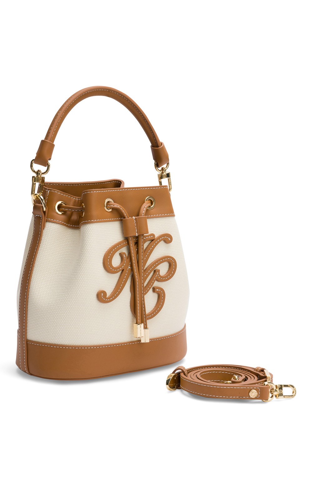 Perfectly timed for the season, this ladies Holland Cooper Amalfi monogram bucket bag is offered in a hard-wearing woven canvas bound in leather.