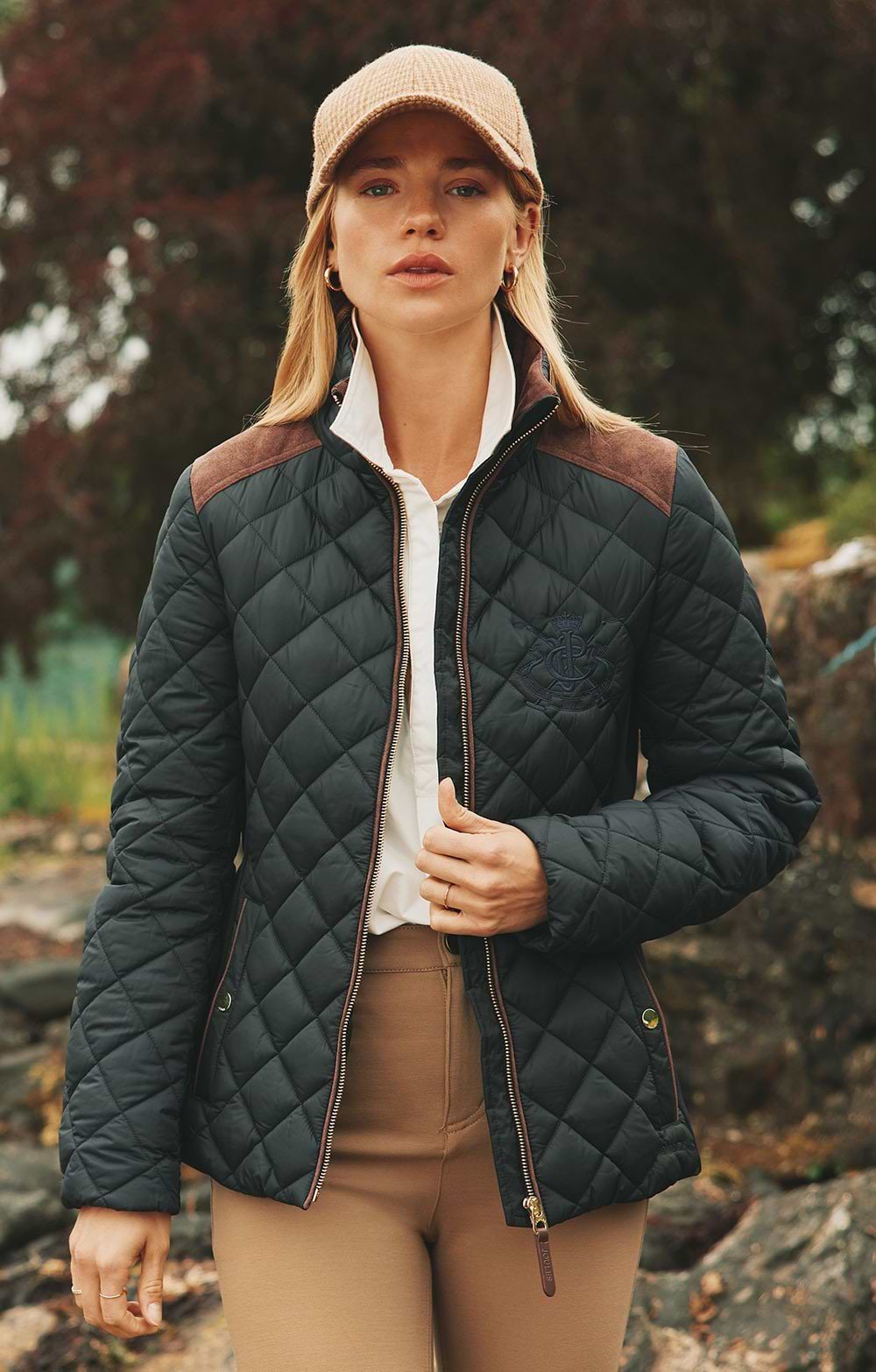 Diamond quilt showerproof jacketStand collar with faux suede liningZip fastening with protective stripFaux suede shoulder patchesJoules crest embroidery to chestAdjustable back tabHand-warmer pockets with press-stud fasteningsCurved hem, lower at the backJoules embroidery to back collarEnjoy wearing with a country shirt and jodhpur style trousers for equestrian-inspired style, or just throw on over your jeans for an instant upgrade to your off-duty look.