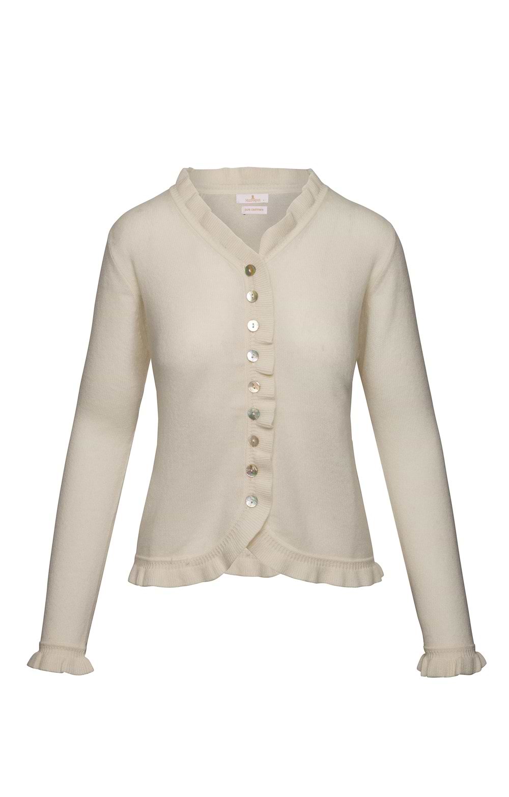 Pure cashmere knitShaped classic fitRuffled hem and cuffsV-necklineShell button frontPair it with linen trousers and espadrilles for a breezy feel, or style with a pencil skirt and kitten heels for more formal occasions.