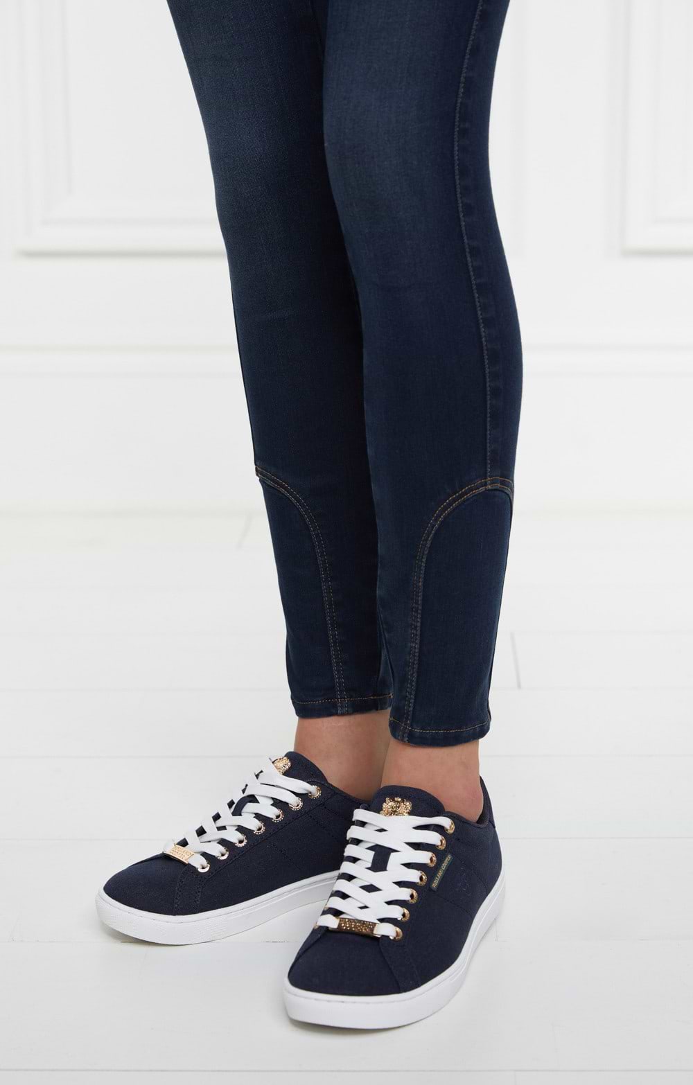 Designed for everyday wear, the ladies Holland Cooper Chelsea court trainers feature premium cotton canvas, gold hardware, and arch support for all-day comfort.